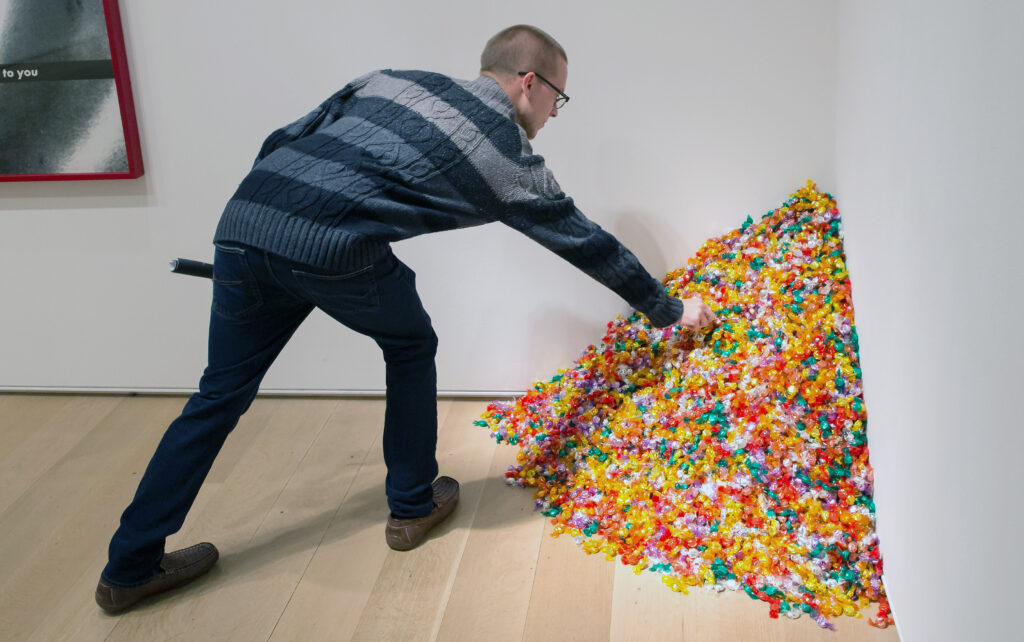 In 1991, Felix González-Torres placed a pile of wrapped candies in a gallery to commemorate the loss of his close friend to AIDS — Untitled” (Portrait of Ross in L.A.). Visitors were free to take candies away. The gradually diminishing pile of candies mirrored the deterioration and disappearance of patience consumed by the disease.