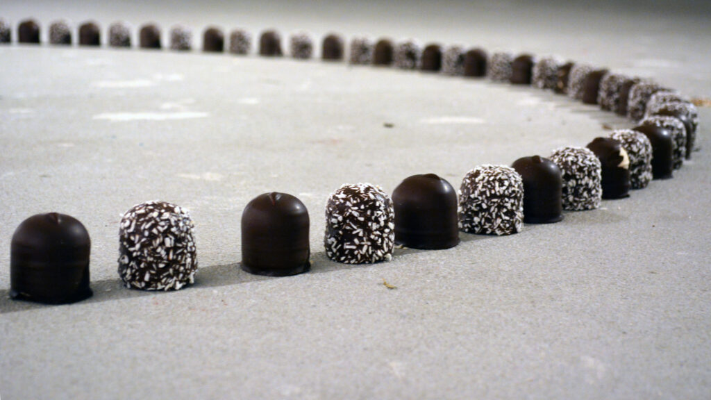 As mass-produced, inexpensive sweets, Schwedenbomben introduce irony and a camp aesthetic rooted in queer culture. They fuse the motif of memento mori (Latin for “remember that you must die”) with exaggeration, humor, and artifice. In this context, Schwedenbomben become a camp reinterpretation of memento mori.