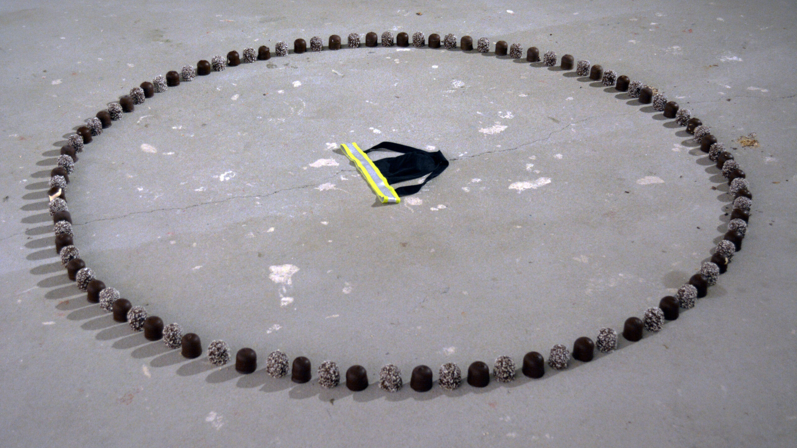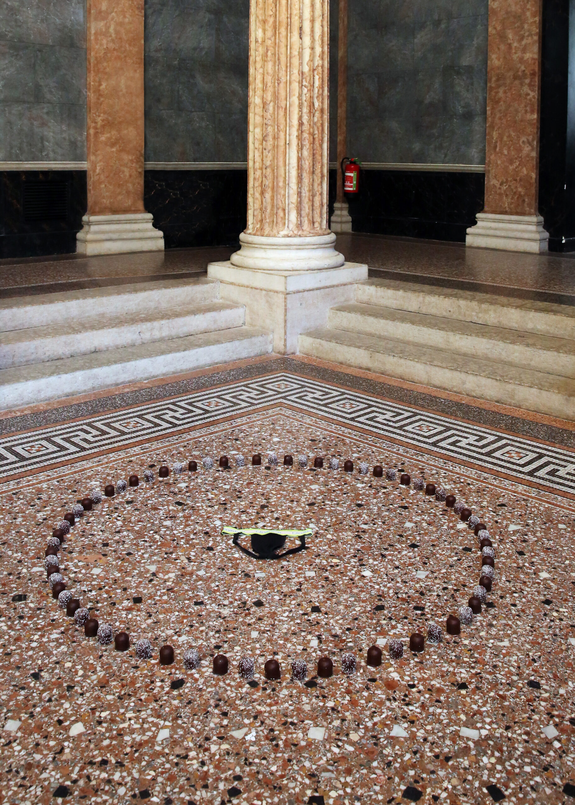 At the center of the installation rests a jockstrap—men’s underwear popular among gay men that exposes the buttocks. It is encircled by Schwedenbomben—Austrian chocolate-coated foam sweets on wafers. This dessert, whose delicate shell cracks at the slightest touch, evokes the vanitas tradition and Baroque still lifes, in which desserts functioned as a meditation on the fleeting nature of life and the futility of earthly pursuits.